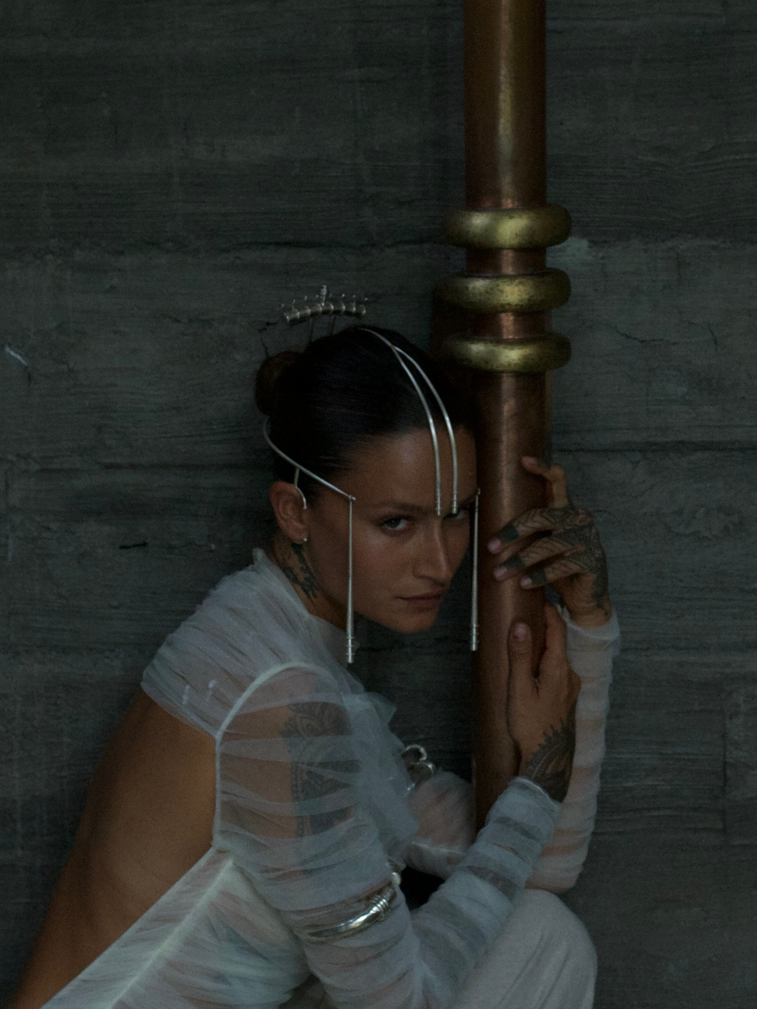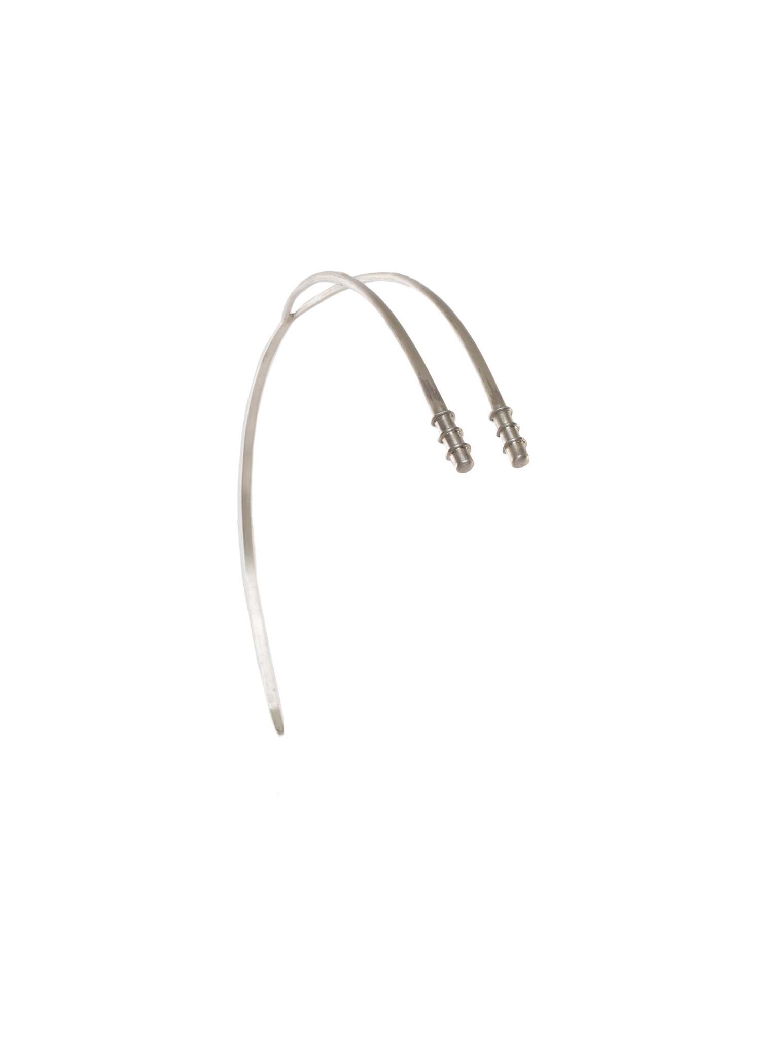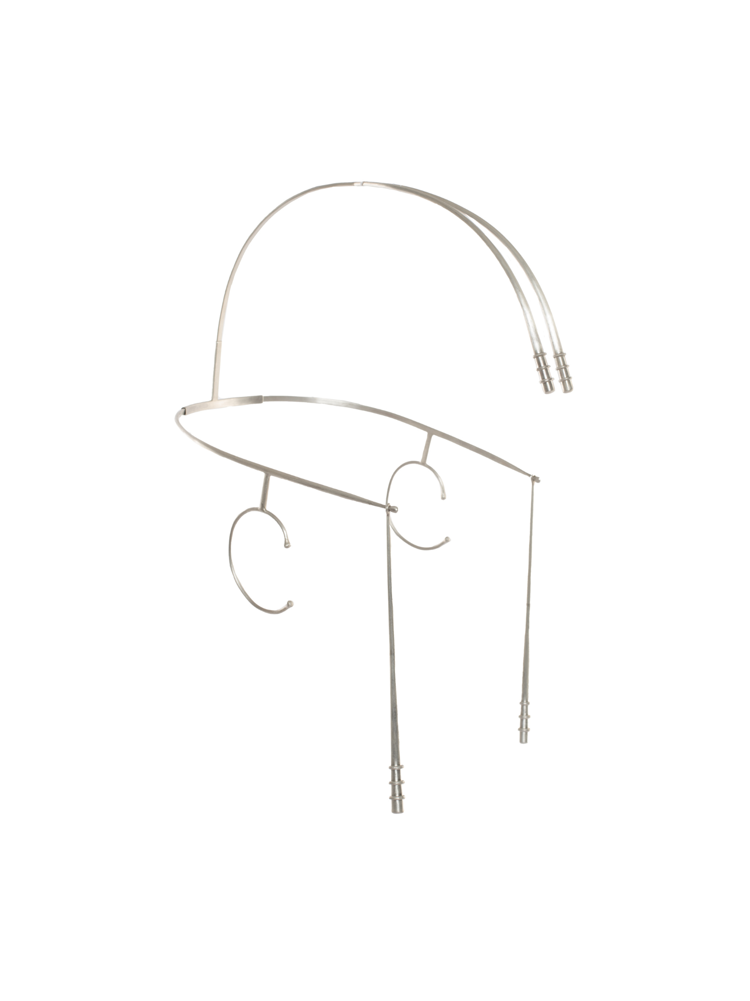 The central forehead piece can be worn on its own for a minimal statement, or combined with the side linear elements falling along the face for a more elaborate look. A modular design that invites mixing and matching to suit your style.