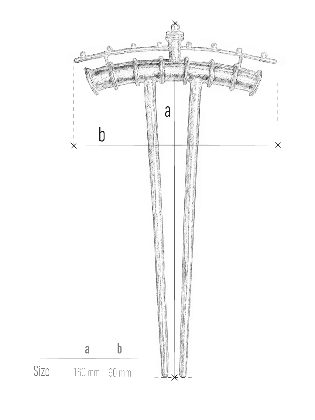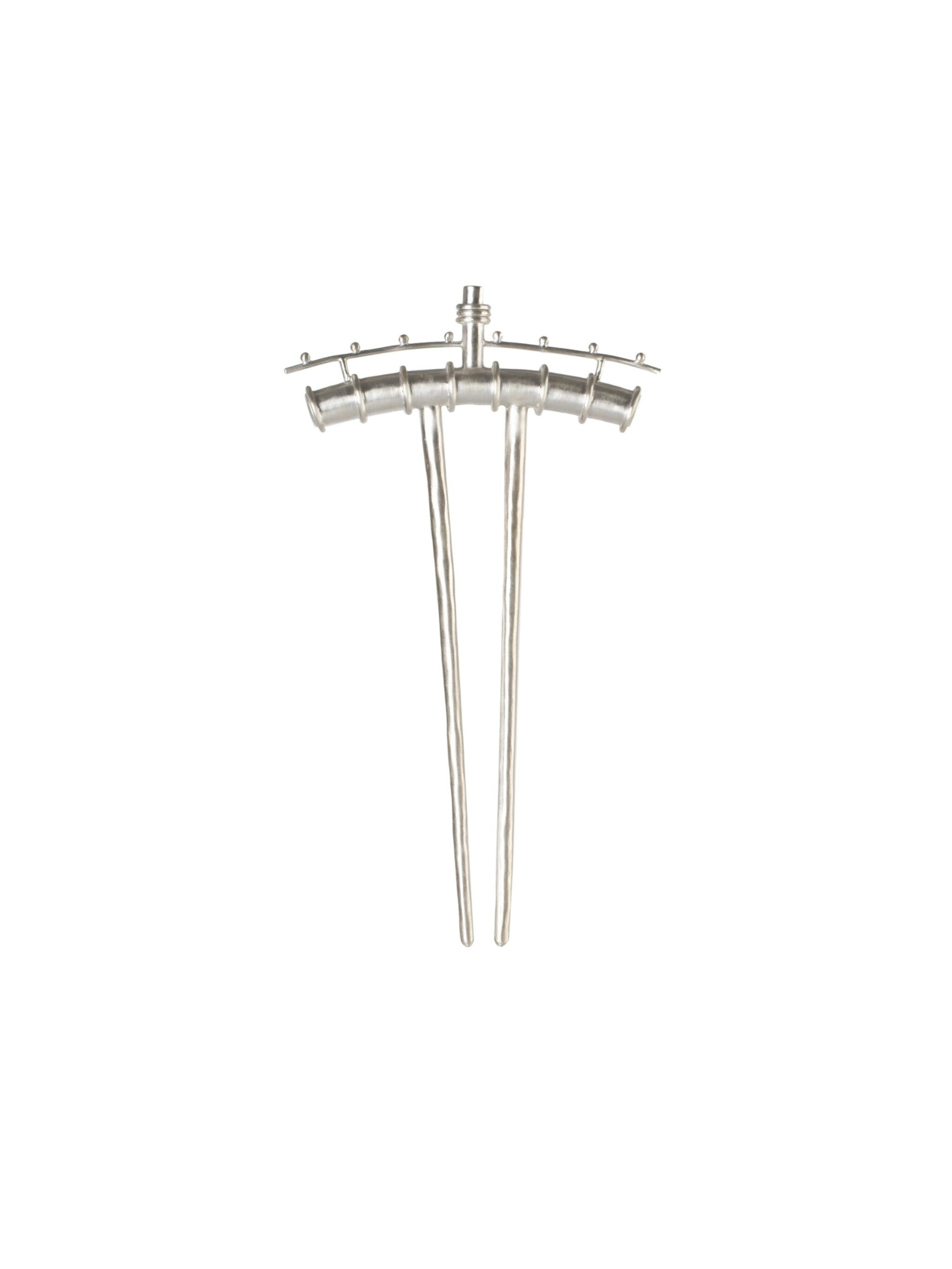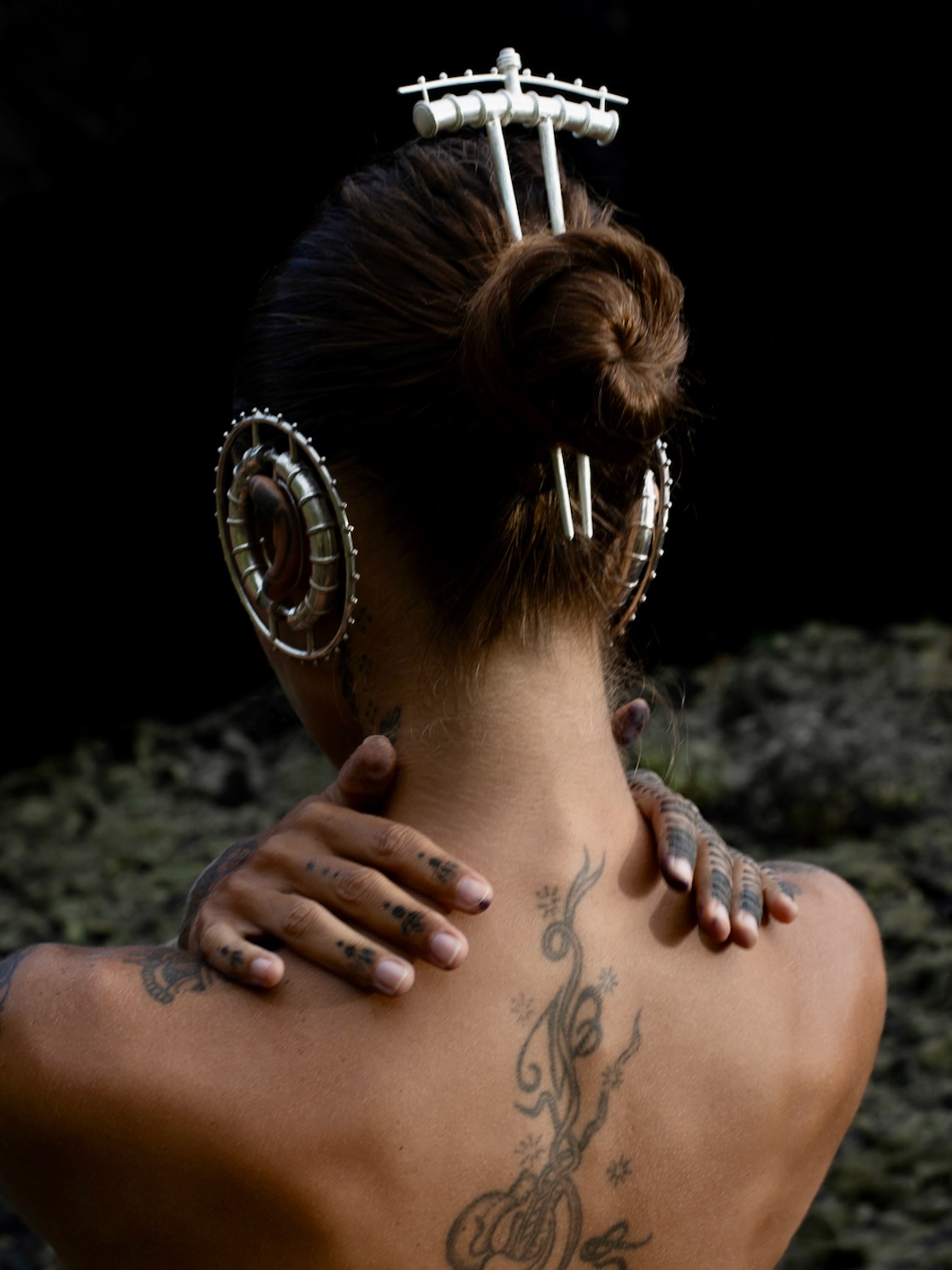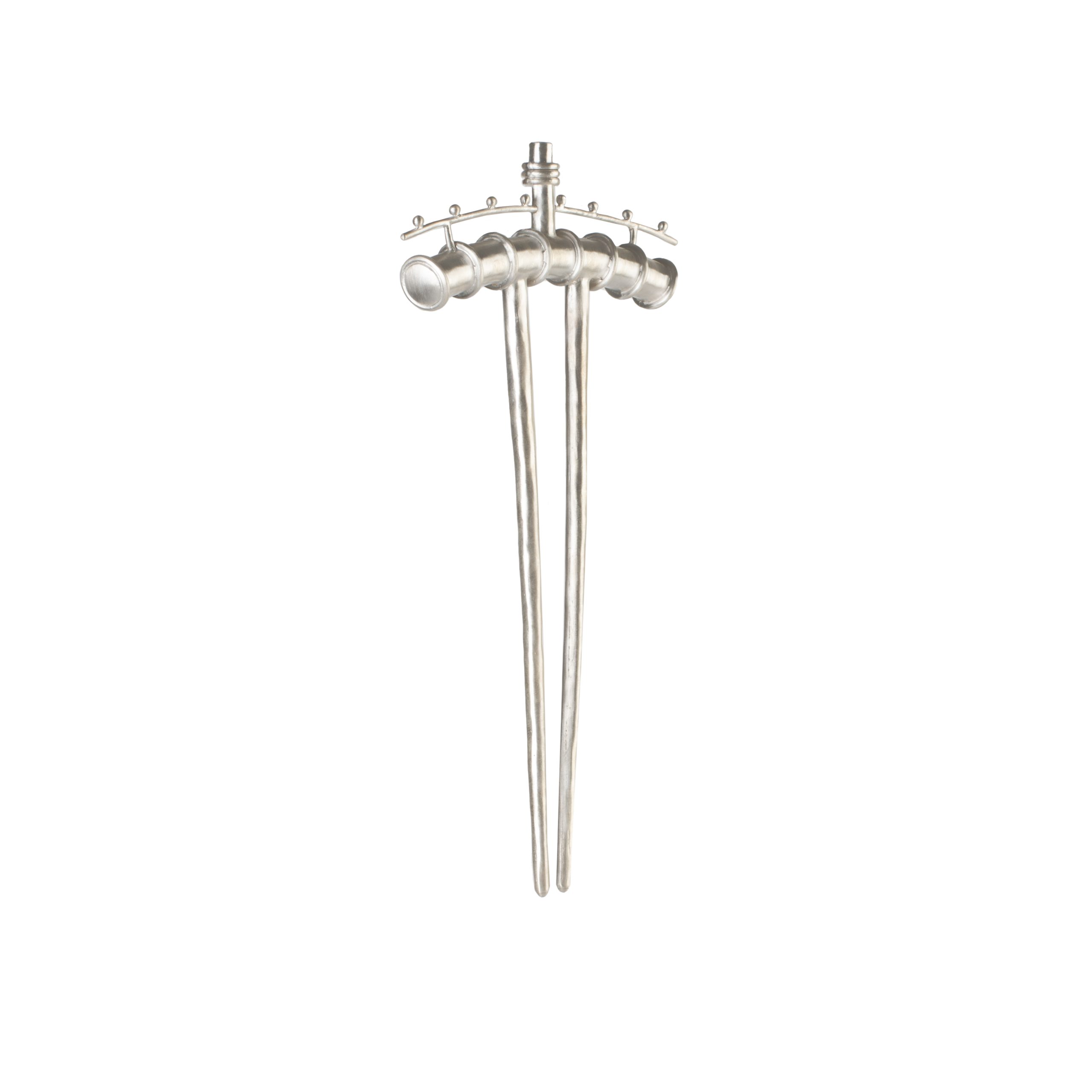 A sculptural hairpin , balancing precision with strength, anchoring the hair in a crown-like silhouette.